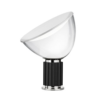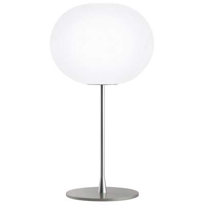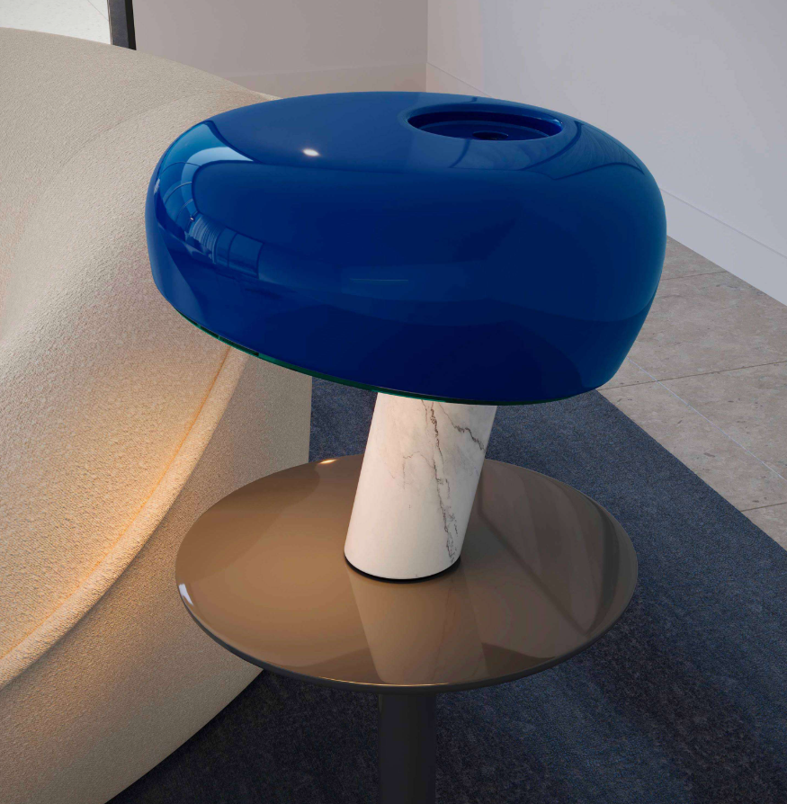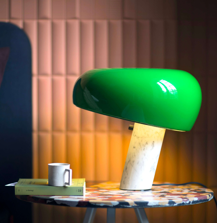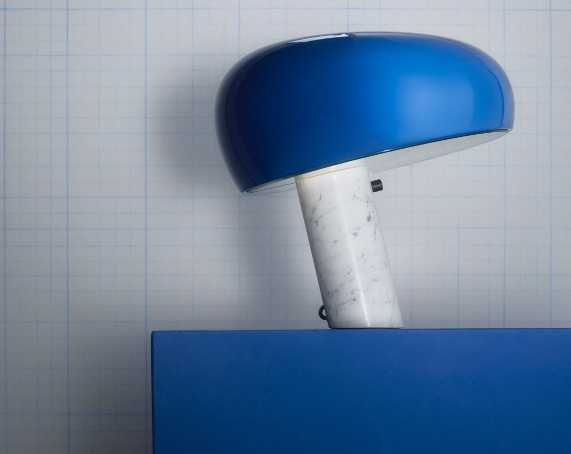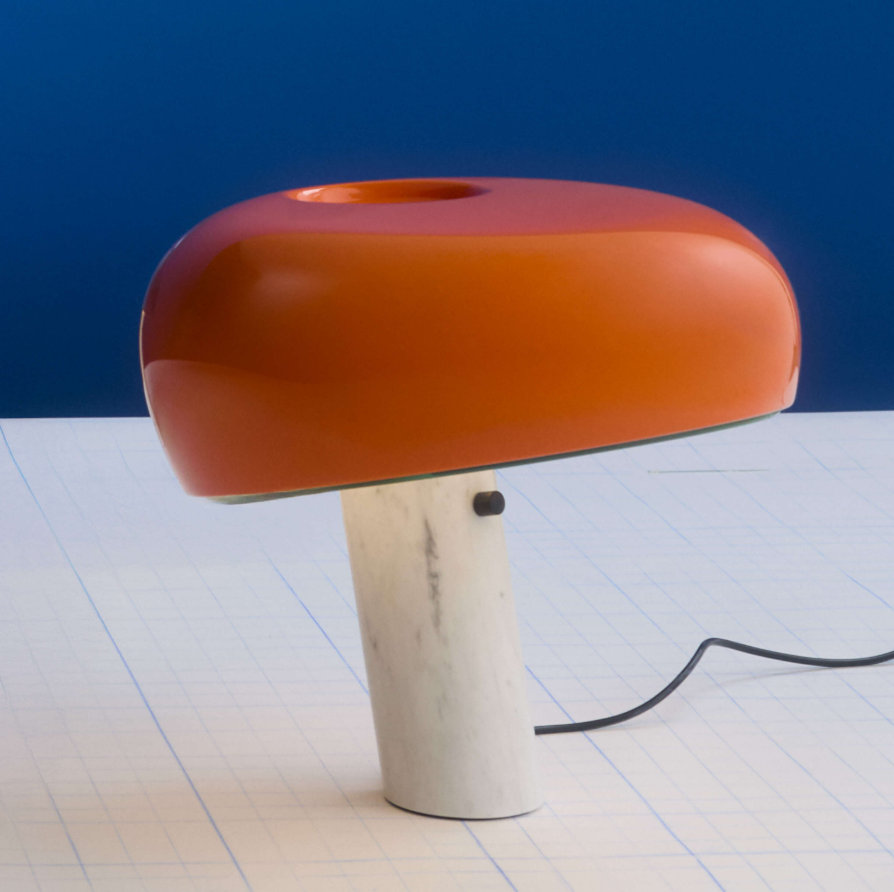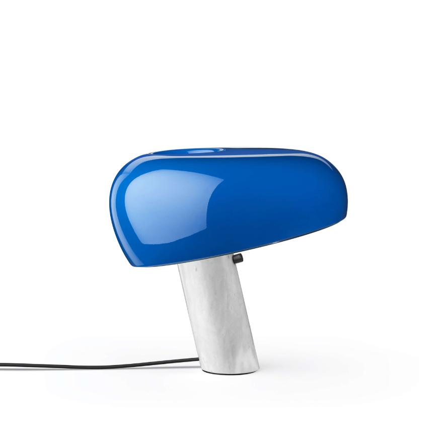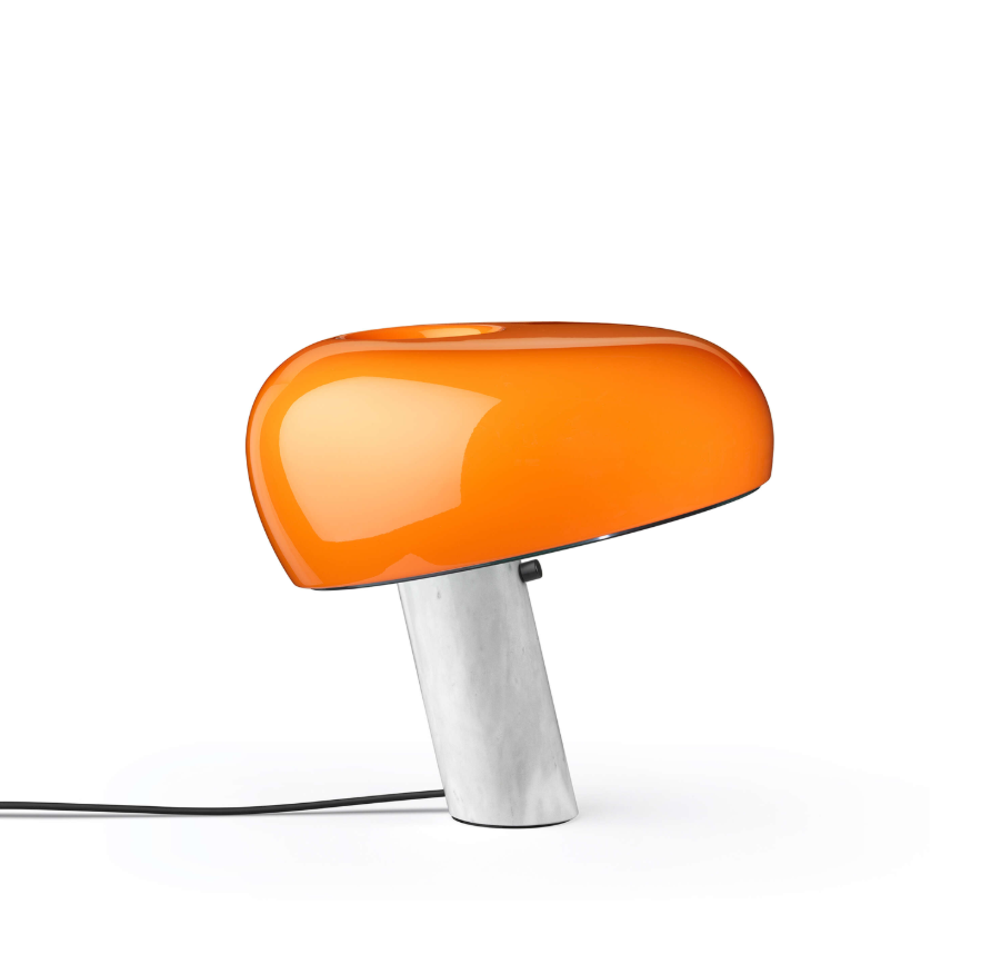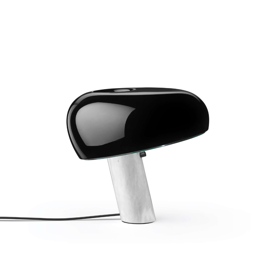 Snoopy is a table lamp providing direct light through a thick glass disc and an enameled reflector, both resting in perfect balance on a white marble base. The original design by was re-introduced in 2003. Table lamp giving direct light with enameled metal reflector and integral On/Off touch dimmer with sensor on the white marble base.