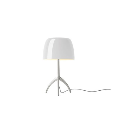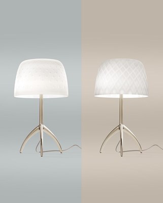 Plass resembles a Murano glass pearl hit by the sun’s rays, but here the light comes from within, rather than from outside, refracted by the incisions on the surface. The unique effect it produces is even more immediate and usable in the new Plass media lamp suitable for medium-sized spaces.