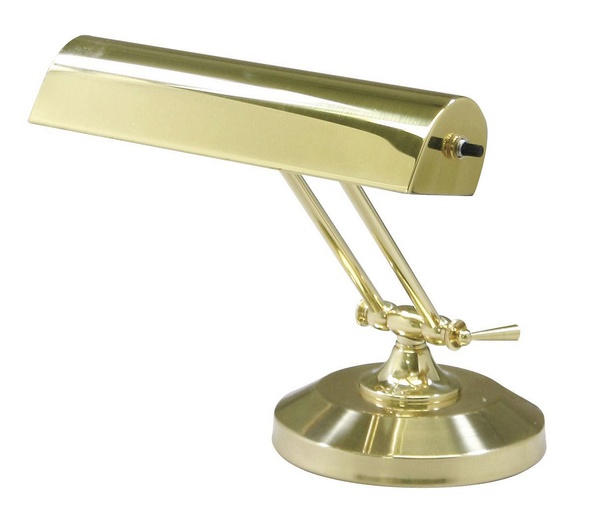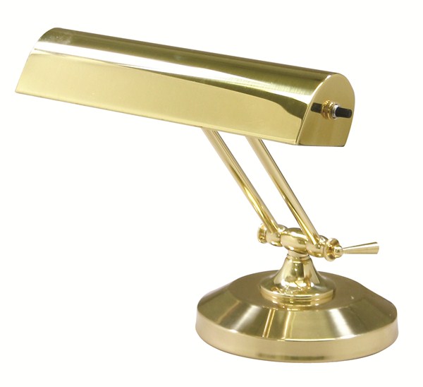 P10-150 Single adjustment arm small piano or desk lamp in polished brass with 10" shade; switch on shade. Adjustable from 0" to 8"; 6" round base. 9' brown cord.