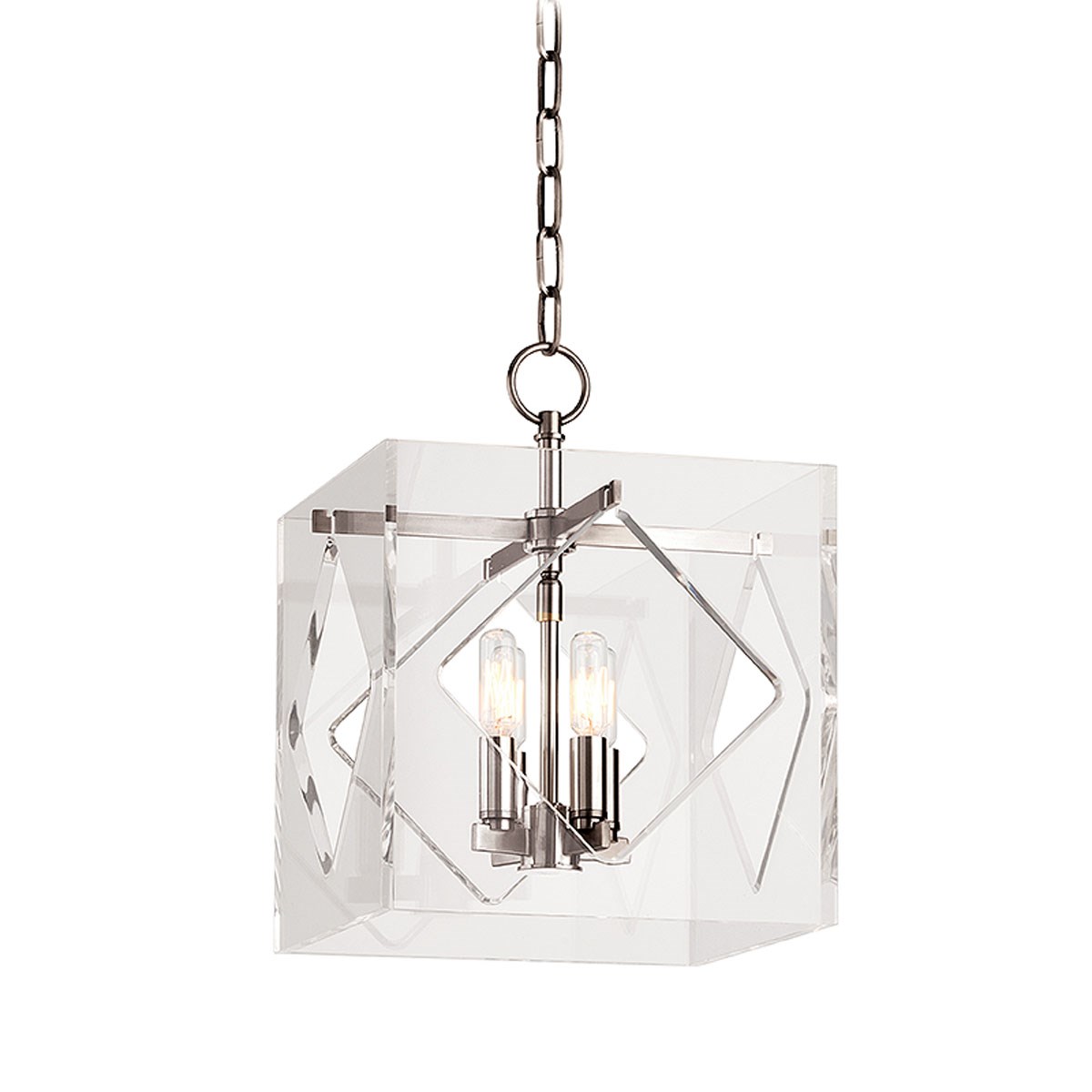 Travis 4 Light Pendant. Mixing the timely with the timeless, American designers created an ultra glamorous look that defines the silver screen's golden age. Travis draws inspiration from Hollywood Regency style by encasing a sleek and elegantly proportioned chandelier in a cut and polished cube of modern acrylic glass.