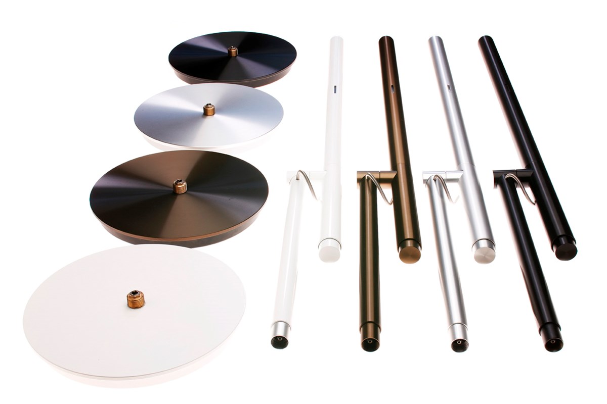 Brazo transforms from table to floor model with a simple extension arm and ships flat-packed for easy transport.